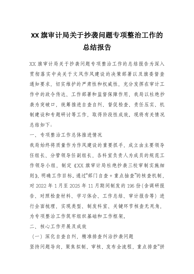 XX旗审计局关于公文抄袭问题专项整治工作的总结报告