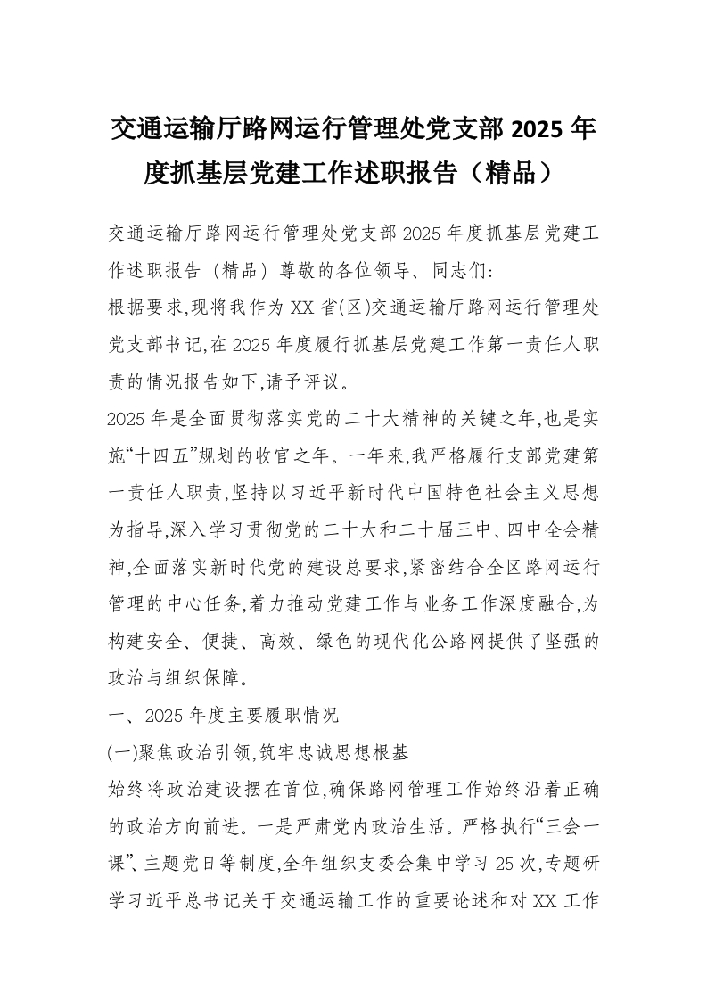 首页材料汇编交通运输厅路网运行管理处党支部2025年度抓基层党建工作述职报告(精品)
