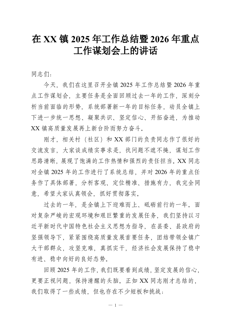 在XX镇2025年工作总结暨2026年重点工作谋划会上的讲话