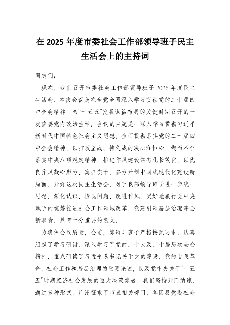 首页工作文档在2025年度市委社会工作部领导班子民主生活会上的主持词