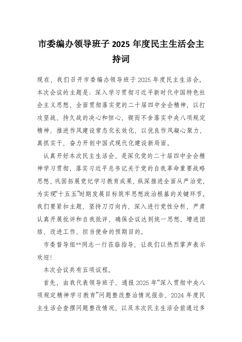 首页工作文档市委编办领导班子2025年度民主生活会主持词