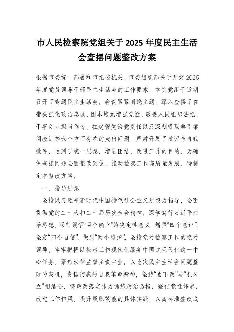 首页工作文档市人民检察院党组关于2025年度民主生活会查摆问题整改方案