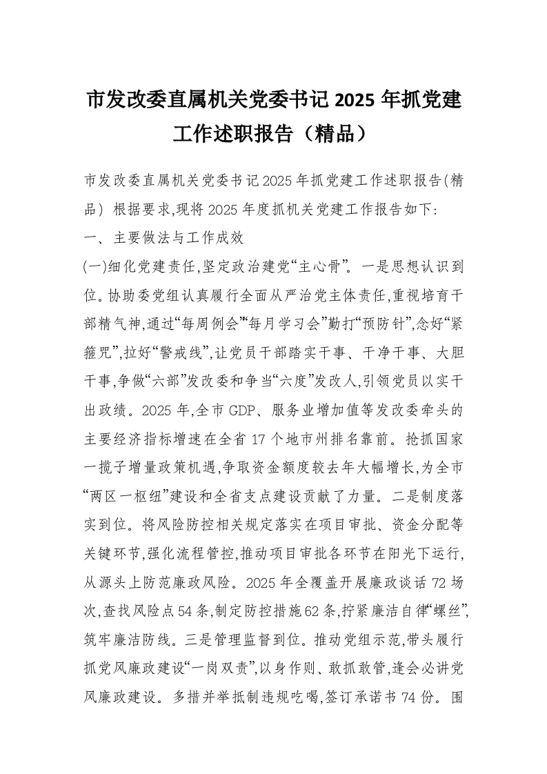 市发改委直属机关党委书记2025年抓党建工作述职报告(精品)