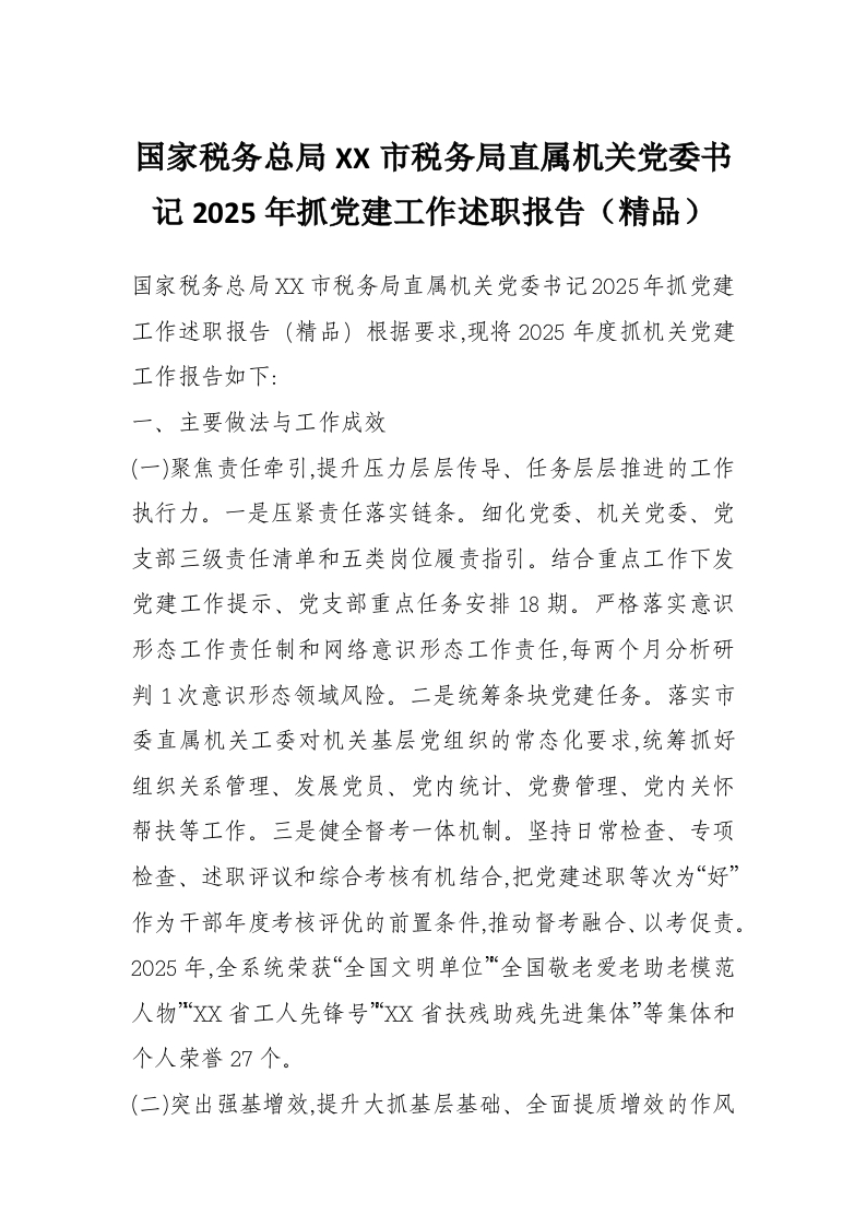 国家税务总局XX市税务局直属机关党委书记2025年抓党建工作述职报告(精品)