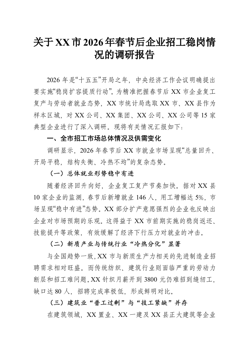首页工作文档关于XX市2026年春节后企业招工稳岗情况的调研报告
