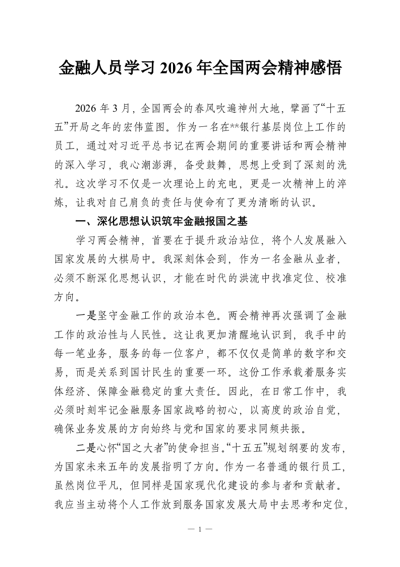 金融人员学习2026年全国两会精神感悟