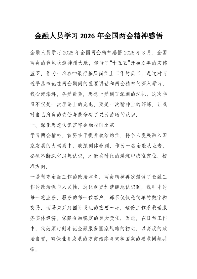 金融人员学习2026年全国两会精神感悟