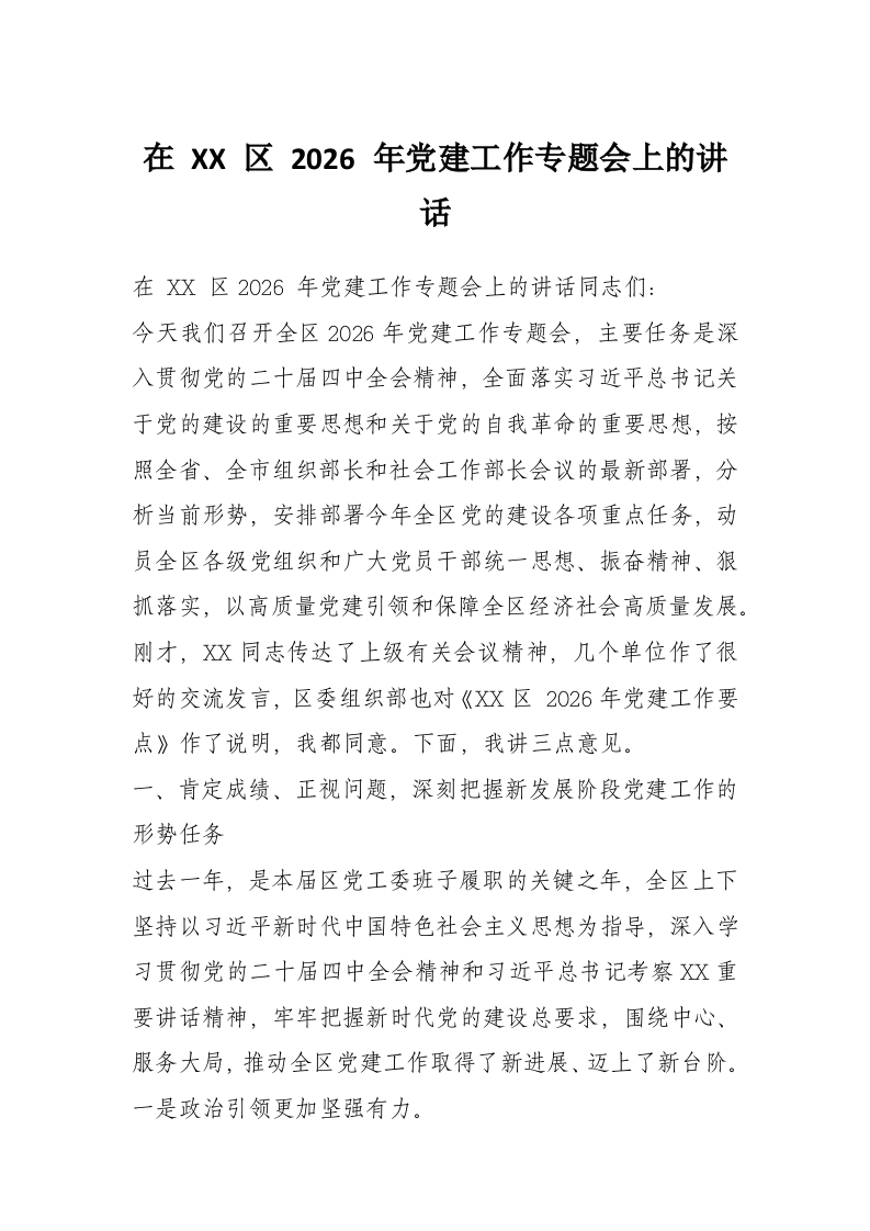 首页工作文档在 XX 区 2026 年党建工作专题会上的讲话