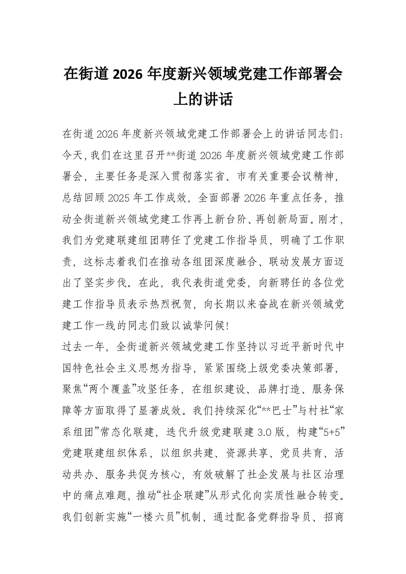 在街道2026年度新兴领域党建工作部署会上的讲话
