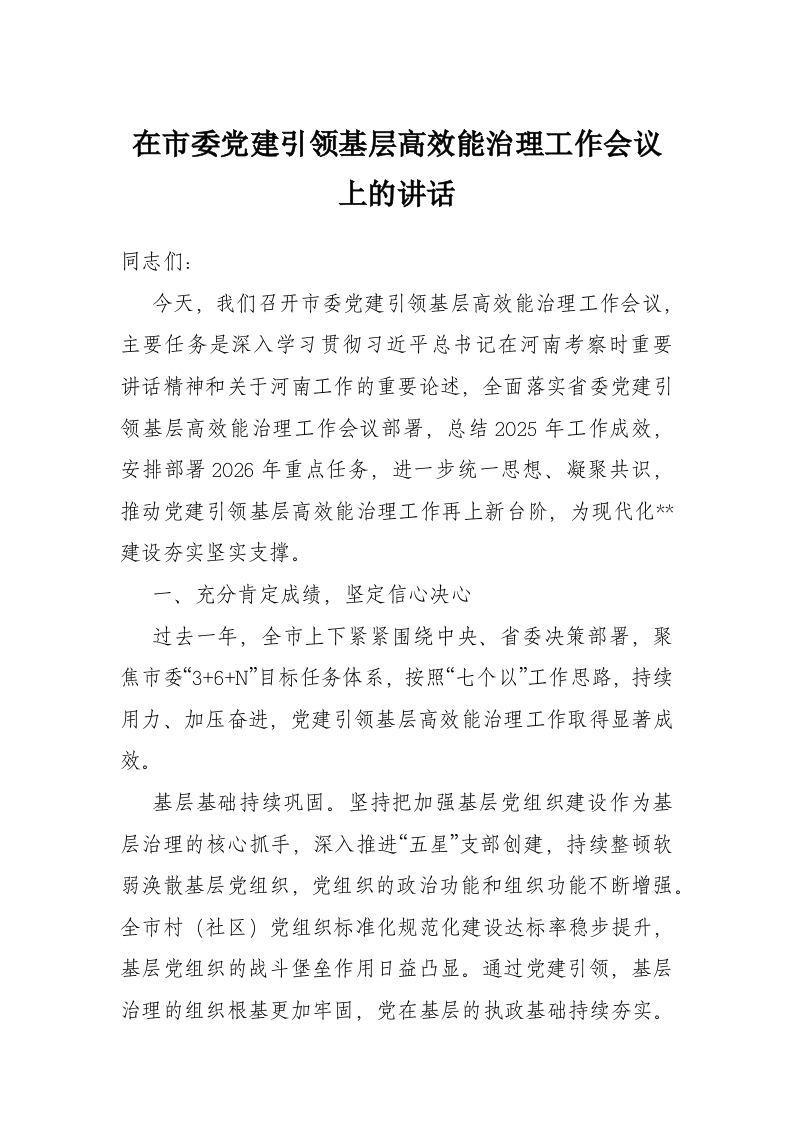 在市委党建引领基层高效能治理工作会议上的讲话