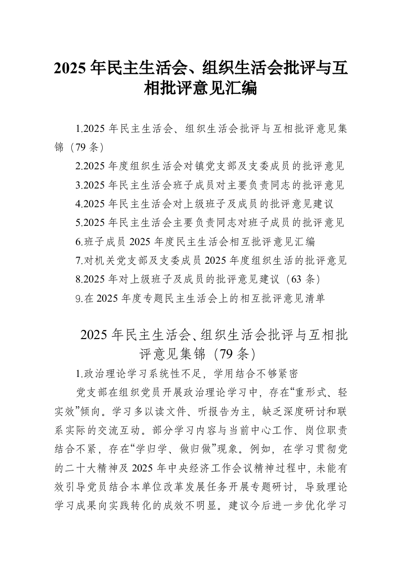 2025年民主生活会、组织生活会批评与互相批评意见汇编