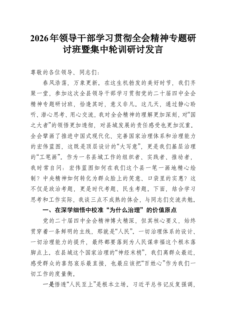 2026年领导干部学习贯彻***精神专题研讨班暨集中轮训研讨发言