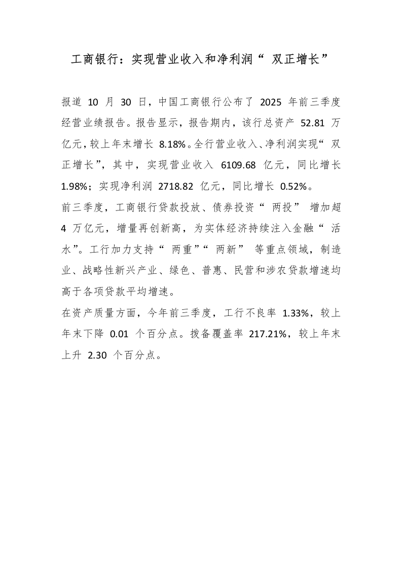 工商银行:实现营业收入和净利润“ 双正增长”_副本
