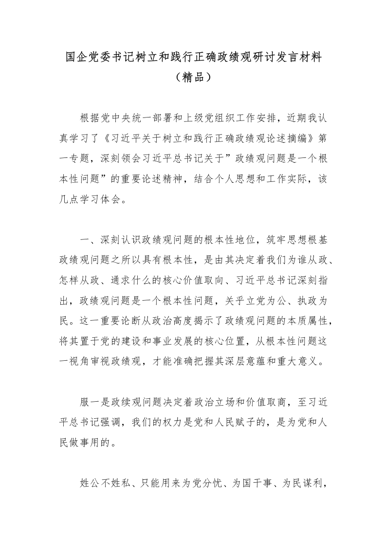 首页精选范文国企党委书记树立和践行正确政绩观研讨发言材料(精品)_副本