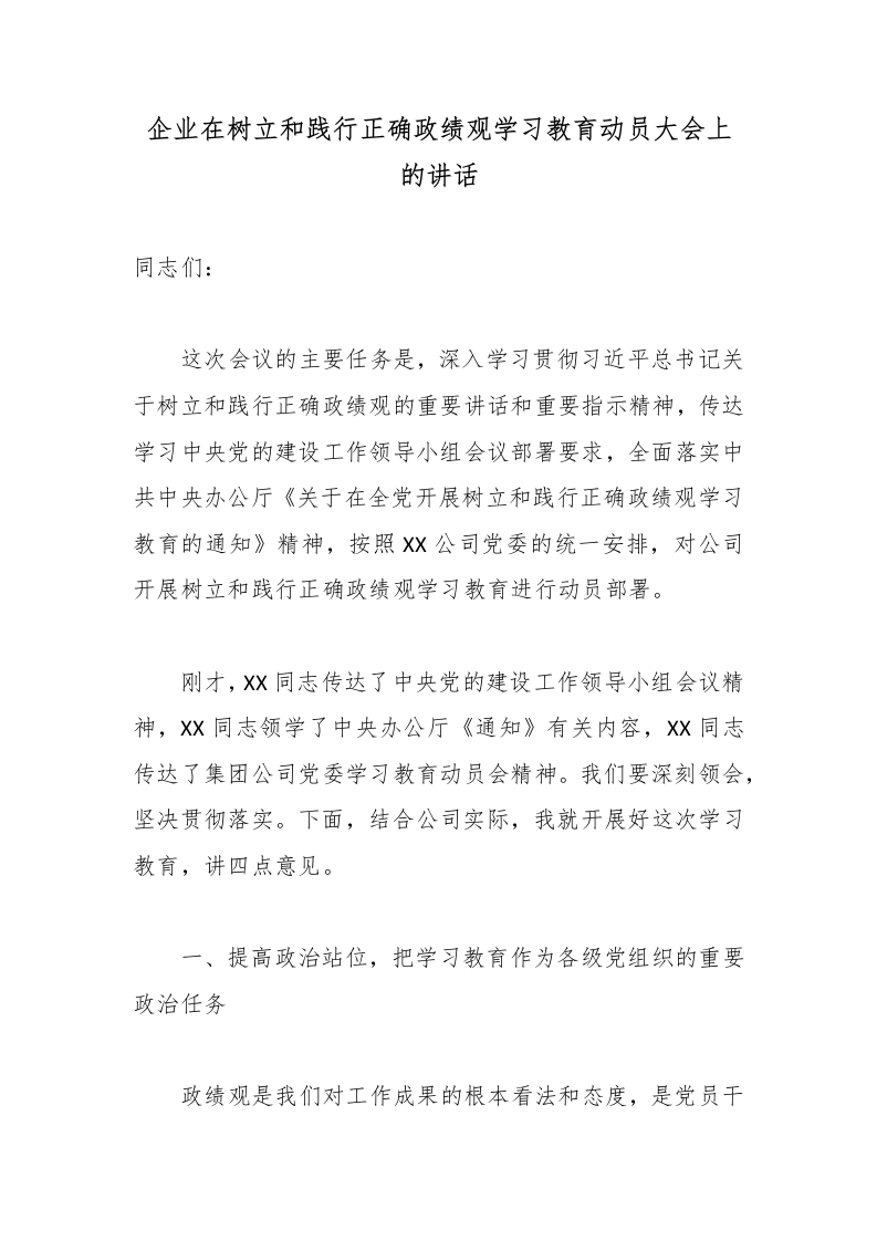 首页讲课讲稿企业在树立和践行正确政绩观学习教育动员大会上的讲话_副本