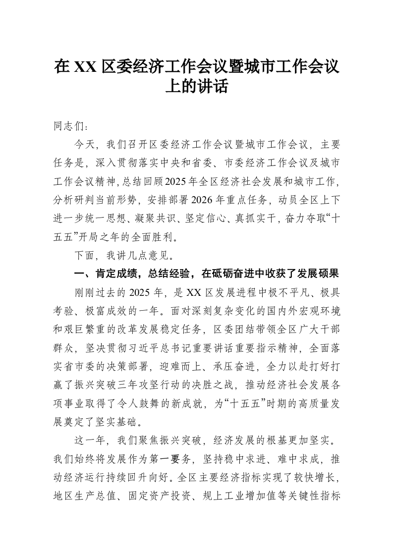 在XX区委经济工作会议暨城市工作会议上的讲话