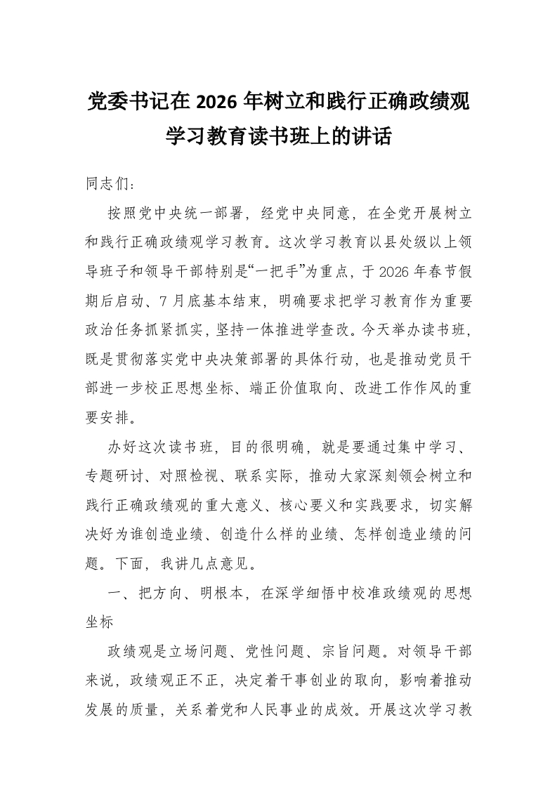 首页讲课讲稿党委书记在2026年树立和践行正确政绩观学习教育读书班上的讲话