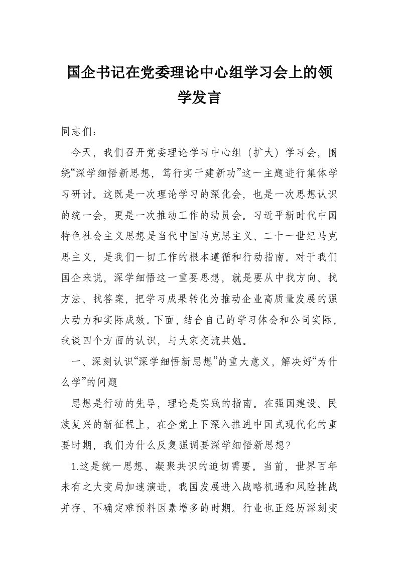 国企书记在党委理论中心组学习会上的领学发言