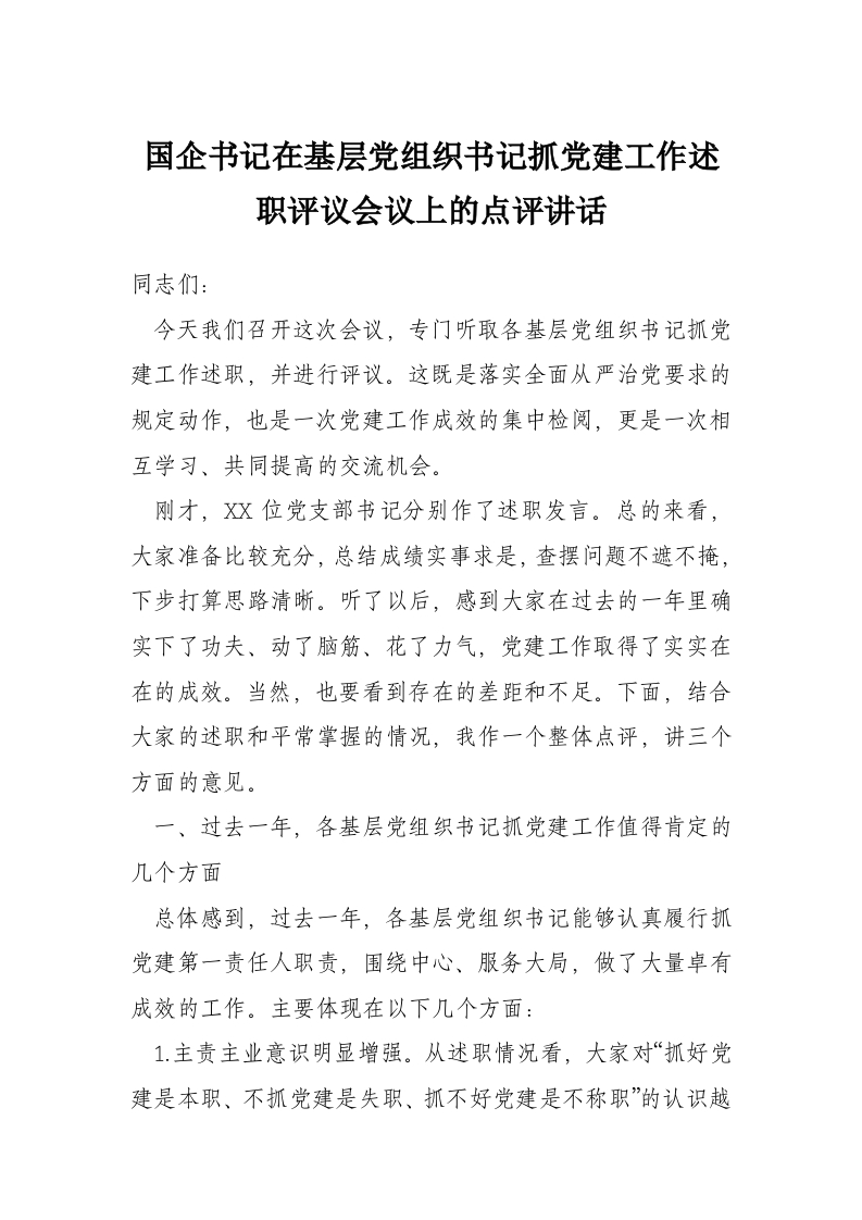 国企书记在基层党组织书记抓党建工作述职评议会议上的点评讲话