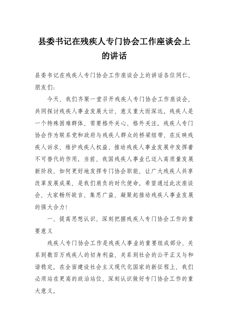 县委书记在残疾人专门协会工作座谈会上的讲话