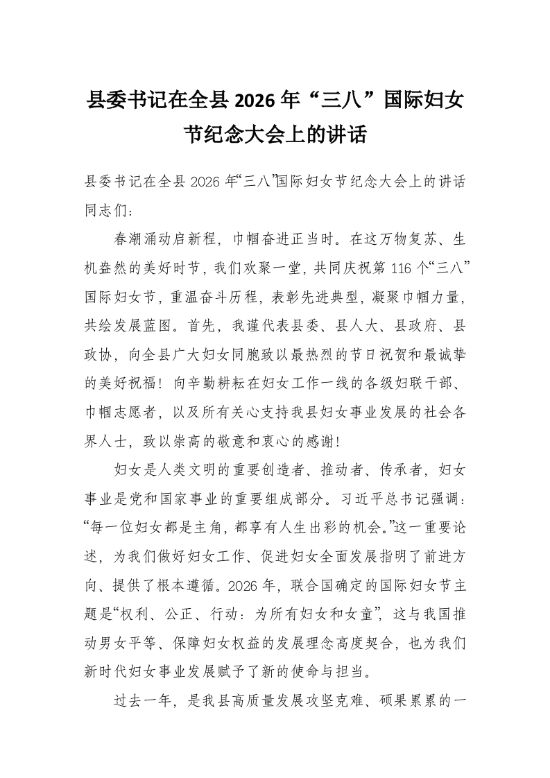 首页工作文档县委书记在全县2026年“三八”国际妇女节纪念大会上的讲话